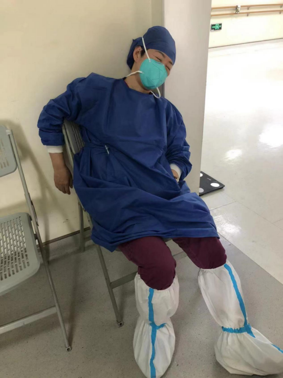 志愿者拍下了一張照片:一位醫護人員累得癱坐在椅子上,靠著墻角睡著了。