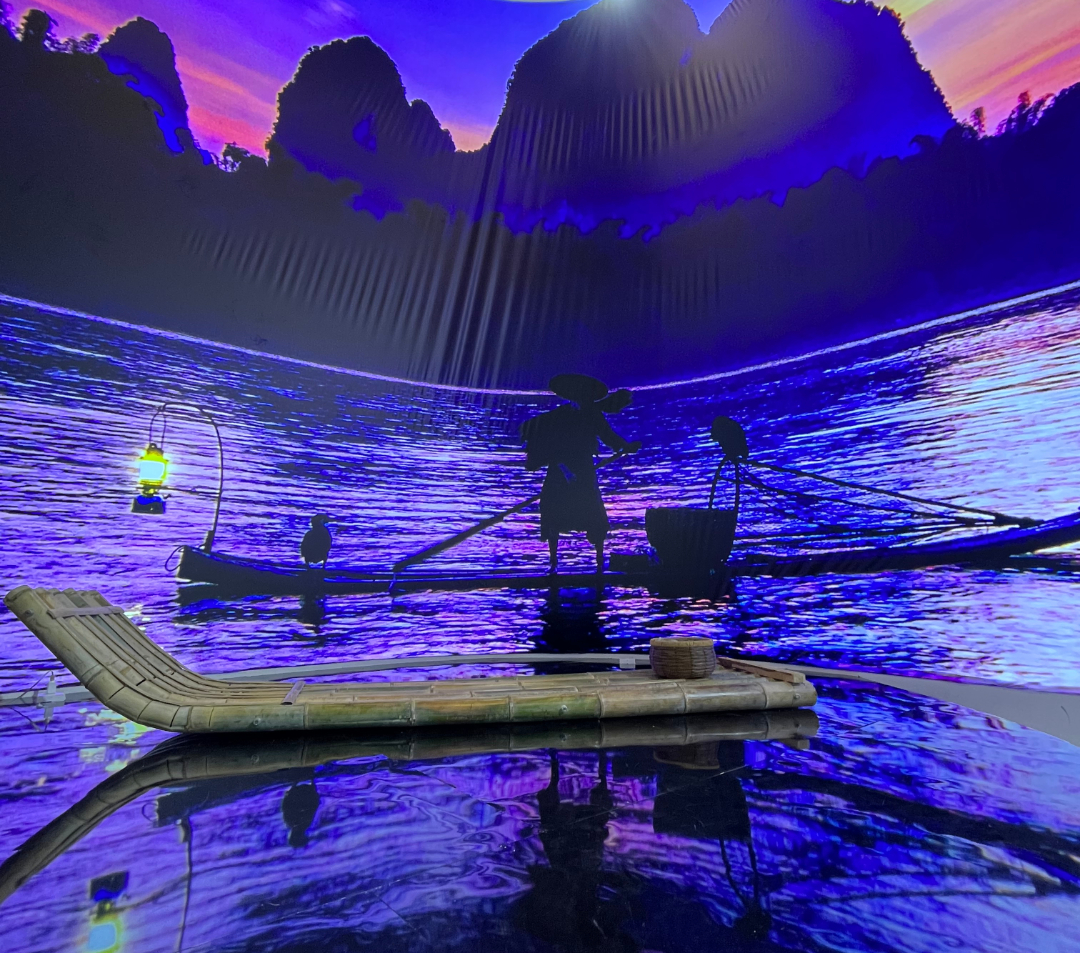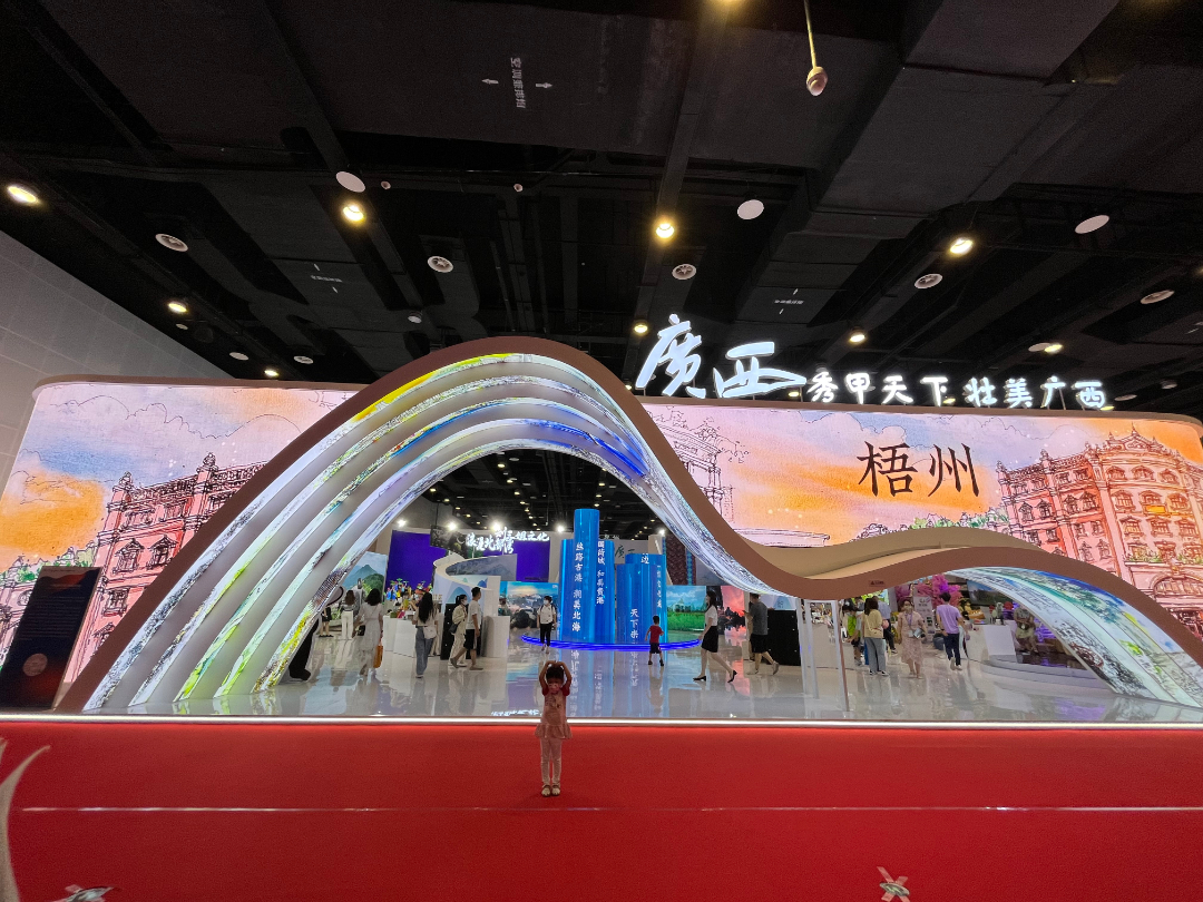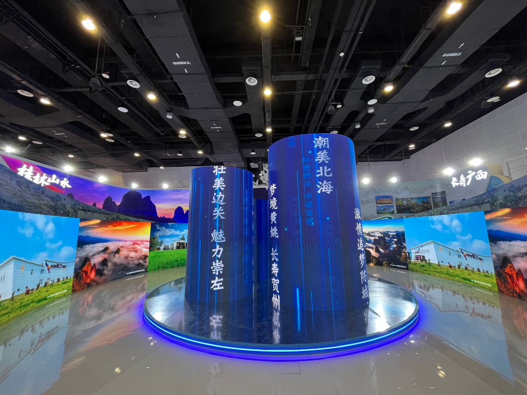 進入文旅康養展區后,映入眼簾的便是廣西文化旅游展廳。廣西文化旅游展廳“以屏為墻”,通過“大屏+大景”虛實結合的形式,讓廣西十四個地市秀美的山水風光躍然于“屏”上,旖旎的山水、浩瀚的大海、壯麗的邊關、寧靜的田園……將八桂的詩意通過流動的方式呈現在大家眼前,給參觀者帶來一段沉浸式的八桂繽紛之旅。