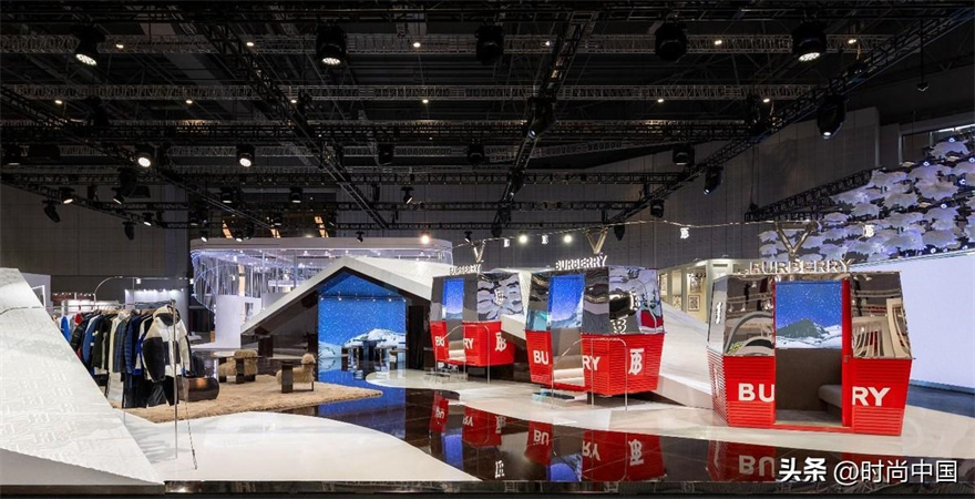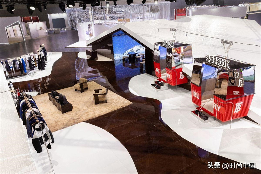 專為本次進博會精心設計和打造的博柏利展臺別具一格,讓人聯想到綿延山脈中舒適的山巔雪屋。在以高山雪地為主題的冰雪世界中,觀眾可以身臨其境,開啟戶外探險之旅。展臺外立面仿佛覆蓋著積雪,其柔和的線條映照著博柏利全新外套系列的絎縫輪廓,并點綴有標志性TB印花,致敬品牌創始人的開拓精神。展臺內布置有雪山纜車,纜線伸向未知的遠方,禮贊無畏探索中的機遇和喜悅。
