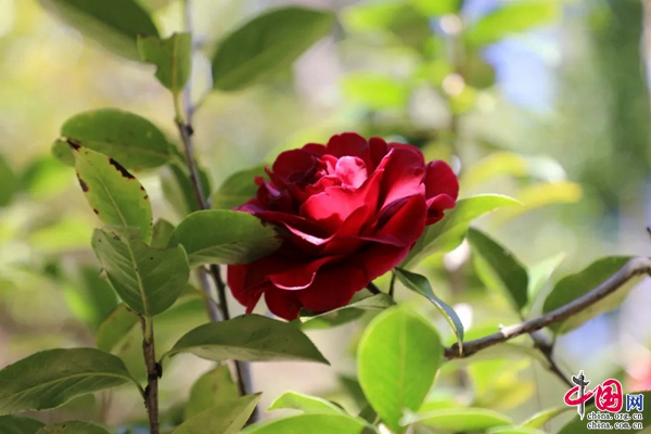 清晨的小山村,薄霧籠罩,清脆的鳥鳴聲回響山谷,朵朵山茶迎風綻放,層層花瓣嬌嫩淡雅,色似胭脂、艷若桃李。一大早,蘭成新就穿梭在紅花綠葉間,十年如一日地呵護著自己栽培的每一株山茶。