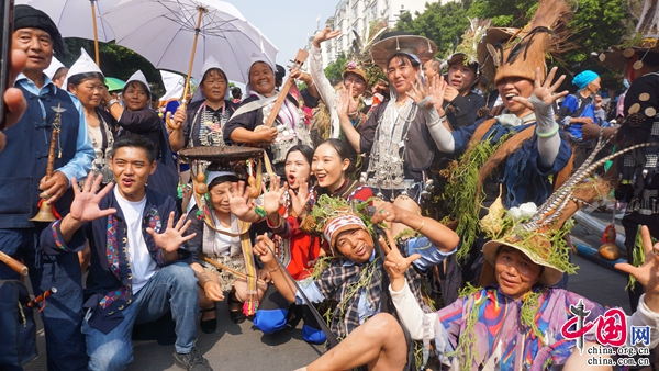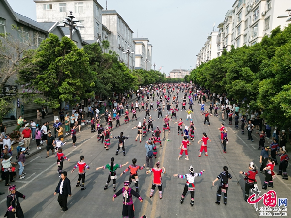 4月23日,云南省紅河州紅河縣舉行“萬人樂作舞”表演活動?;顒蝇F場,由哈尼族、彝族、漢族、傣族和瑤族等民族組成的上萬名樂作舞表演者身著紅河特色的各式民族盛裝,把整條蓮花路妝點得五彩斑斕,成了人們展示各式民族服飾和民族風情的大展臺。