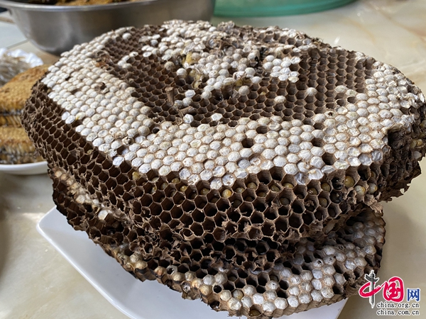 油炸蠶蛹和油炸竹蟲,能最大限度的保留蠶蛹、竹蟲的外形特征,不僅擺盤誘人,更是香氣襲人。包燒螞蚱和包燒螃蟹,是哈尼族最拿手的烹飪手法,把秘制佐料與清洗干凈的螞蚱和螃蟹,用現摘的枇杷葉緊緊包裹,再包上一層錫紙,放到火塘里燒制即可。包燒美食最令人驚艷的便是打開葉子的時候,濃郁的香氣瞬間撲鼻而來。還有水煮螞蟻蛋、舂蜂蛹、油炸水蠆等等,色香味俱全,令人垂涎。