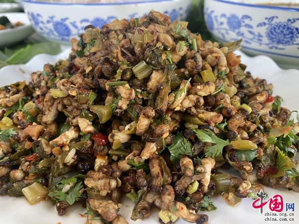 由于食材多元化,制作多樣化,也形成了口味多樣的蟲宴美味。把水腌菜、芫荽、韭菜、辣椒等佐料與酸螞蟻一起腌制,攪拌均勻后,一道酸甜可口的涼拌酸螞蟻便做好了,螞蟻與佐料融合的恰到好處,不愧是一道夏日爽口小吃。