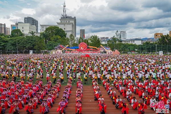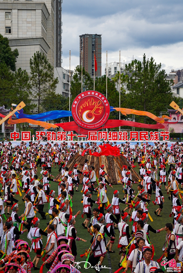 8月7日晚,主題為“鄉村振興筑夢慶來故里七城同創共建福地彌勒”的中國·彌勒第十一屆阿細跳月民族節開幕。十七支來自各鄉鎮街道、東風農場社區管委會、少兒阿細跳月方隊的近2700多名群眾身著盛裝,齊聚彌勒市文化中心足球場,共經風雨、共享喜樂。