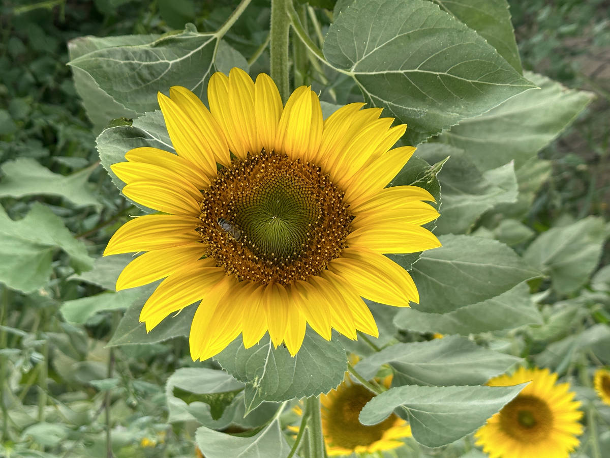 坐上跟了楊澤中十年的“老古董”車,來到了村上的向日葵地?!澳銈兛?!到了?!表樦鴹顫芍兴傅姆较蚩慈?,此時的向日葵花開得正艷,只見蜜蜂正在花朵上勤勞地采著花蜜。