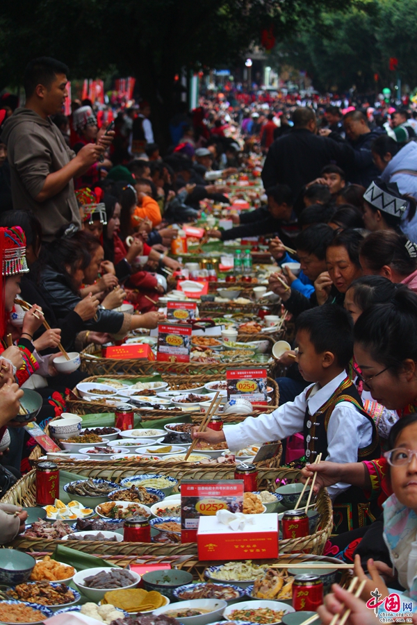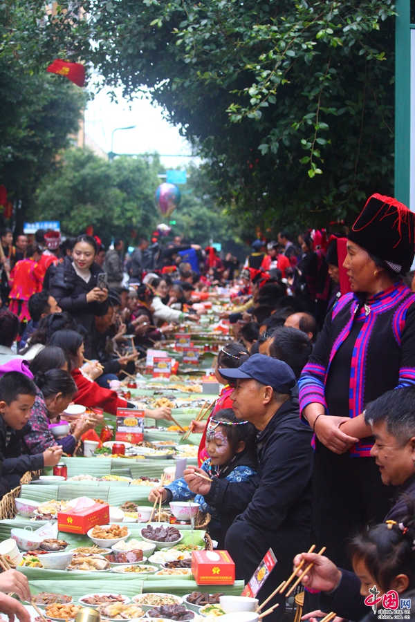 11月19日17時整,云南省紅河州綠春縣4065桌長街古宴火熱開席,千年一街,萬人同宴,來自各地的游客共同舉杯歡慶這一盛大節日。