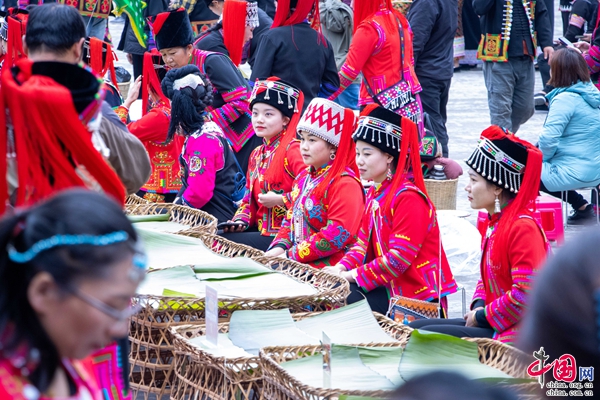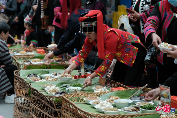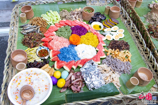 桌連著桌,凳挨著凳。當天,家家戶戶擺上黃糯米、三色蛋、豬、雞、魚、鴨肉、牛肉干巴、麂子干巴、肉松、花生米、歡心谷舞紅米飯、梯田稻米米線等近40種哈尼族風味的菜肴,各種美味令人垂涎。