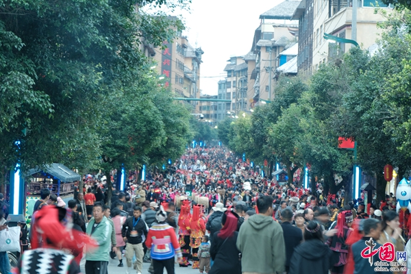 長街宴開始,龍頭率領全寨人高舉酒杯,祝愿來年風調雨順。宴席上,彩燈、美食、嬉笑、擁抱、高歌、碰杯、歡聚一樣不落,上萬名賓客一起唱歌跳舞,互相祝福,一同沉浸在美味與節日喜慶的氛圍里。(杜浩楠)