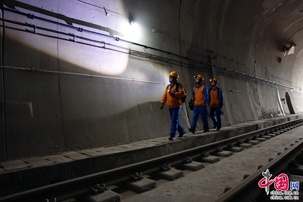 (周宇生和工友一起對麗香鐵路隧道通信設備進行巡視檢查。向攀/攝)