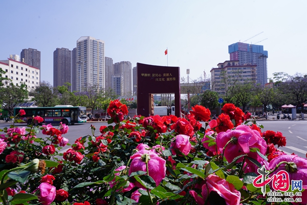 花開花落無間斷,春來春去不相關。四月,昆明這座四季如春的城市,正在呈現無處不飛花的美景。特別是一年長占四時春的月季,紅色、粉色、橙色、白色、黃色花朵一叢叢、一簇簇開得姹紫嫣紅,芳香四溢……北京路、廣福路、彩云北路、國貿路等各條主次干道的樹狀月季競相綻放,迎來了“爆花”狀態,把四月的春城昆明打扮得“繁花團簇、春意盎然”,變得格外浪漫。