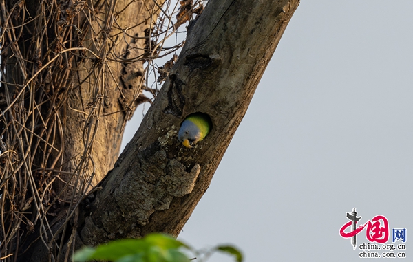 “近幾年來,我們每年都能在瑞麗江畔拍攝到花頭鸚鵡覓食或嬉戲的畫面,但一直沒有找到繁殖的巢穴。那天,我像往常一樣到江邊轉悠,看到2只花頭鸚鵡在一棵樹的樹梢上玩耍。就在我變換角度拍攝它們嬉戲畫面的時候,它們中的1只突然飛進那棵樹樹干上的一個洞里?!鄙鷳B攝影師尹顯倫說道。據悉,經過他連續10多天的蹲守、觀察、拍攝,可以肯定這對花頭鸚鵡在此筑巢育雛。