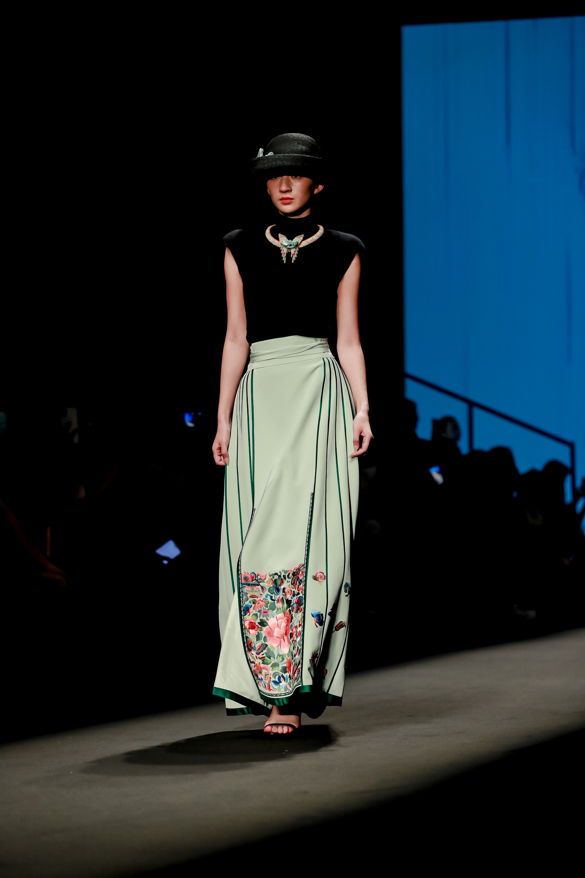 復制篇章,周錦女士從收藏的近400多條馬面裙中找出了魯繡衣線繡馬面裙進行了復制并創新。透亮且純正的色彩以及裁剪工藝上的大幅提升,讓手工繡馬面裙插上了高定的翅膀,成為日??纱┑母呒壏b。