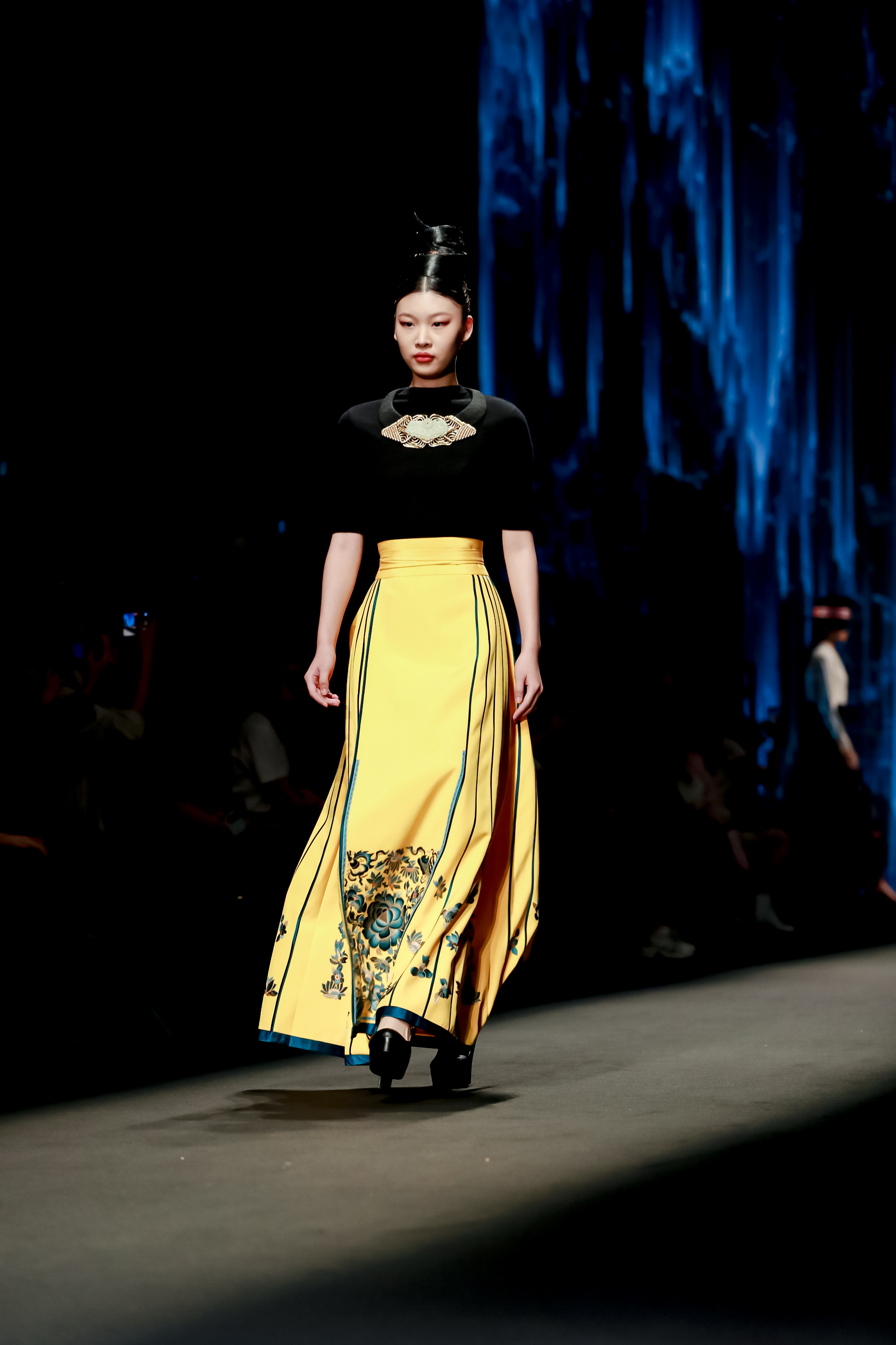 共榮共生篇章,以魯繡二次創作的時尚系列作品為主。手工魯錦與針織面料結合的大禮服,搭配通過中國結編造技術創作的近400套古玉首飾,以及聯手上海帽仕匯創作的二十四節氣齊魯草編帽、新魯錦貝雷帽、鴨舌帽、鳳飛舞時尚帽等,令非遺與新質生產力完美融合在時尚單品與時裝中。