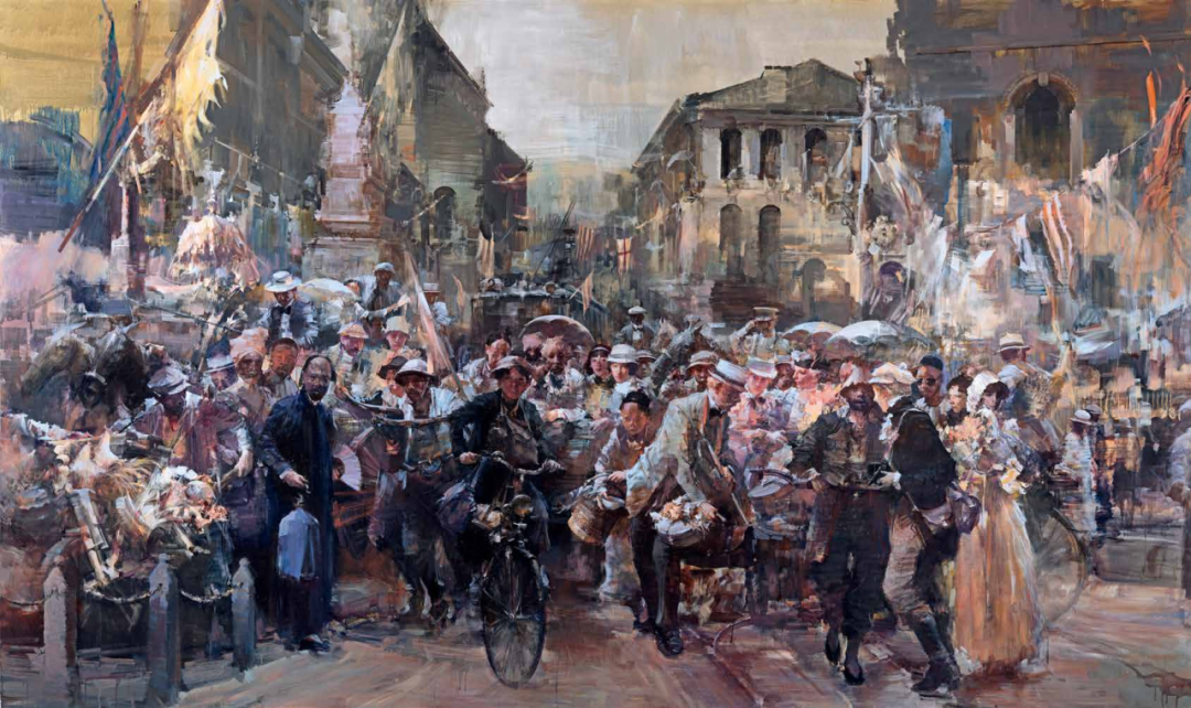 (《我輕輕的敲門——紀念海上畫家任伯年,吳昌碩、虛谷、蒲作英》 157×165cm,油畫,1984)