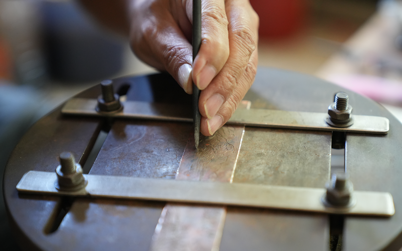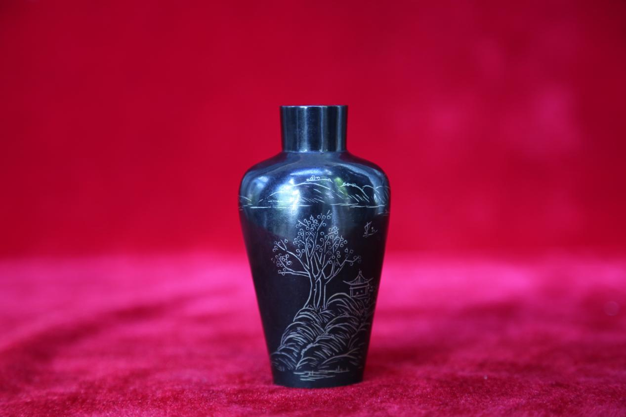 烏銅走銀的技術難點在于煉烏銅、走銀,核心工藝在于鏨刻、捂黑。工匠們通過控制熔點差值,用純銀銀屑填充到鏨刻圖案的凹槽里,以“走”滿為度。同樣的師傅、同樣的器形、同樣的尺寸,每次的制品都不盡相同,這讓烏銅走銀有了獨特的韻味。