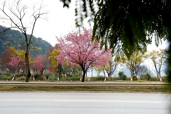 在景區貓貓沖、七零新村的道路沿線,一簇簇冬櫻花在枝頭搖曳生姿,如粉色云霞般絢麗。