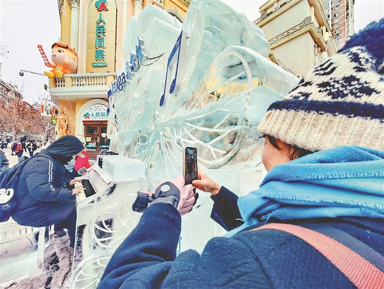 1月9日,哈爾濱市道里區中央大街和西九道街交口,一名游客在彈奏冰鋼琴。樂曲悠揚,飄蕩在百年老街的上空,人們紛紛上前圍觀拍照。