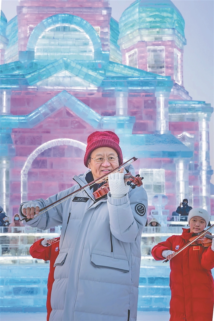 本次活動是哈爾濱冰雪大世界園區首次舉辦小提琴快閃秀?;顒赢斕?,冰城天朗氣清,哈爾濱冰雪大世界宛如童話中的冰雪王國,美輪美奐的冰雪美景在陽光的照耀下璀璨生輝。在第二十六屆哈爾濱冰雪大世界天壇(中國)景觀前,伴隨著絢麗的燈光被點亮,薛蘇里與35位小提琴演奏者共同奏響《龍的傳人》《歌唱祖國》。演奏結束,現場掌聲雷動,歡呼聲此起彼伏。(黑龍江日報記者 劉艷)