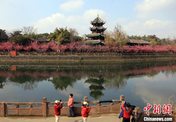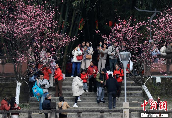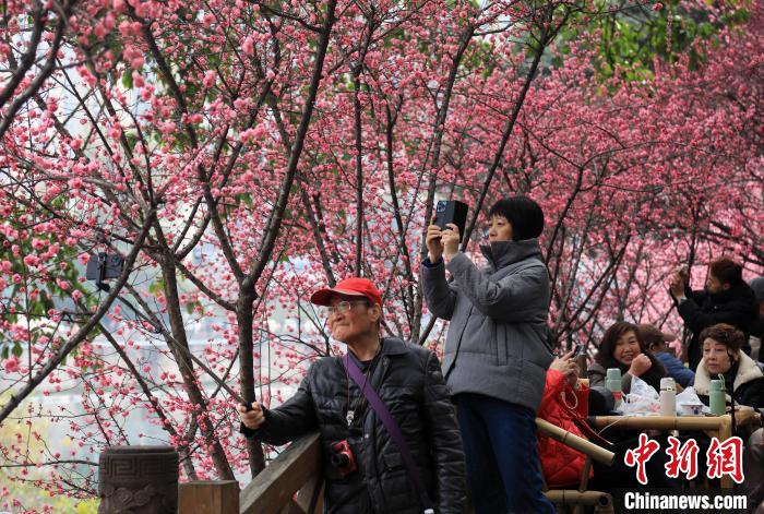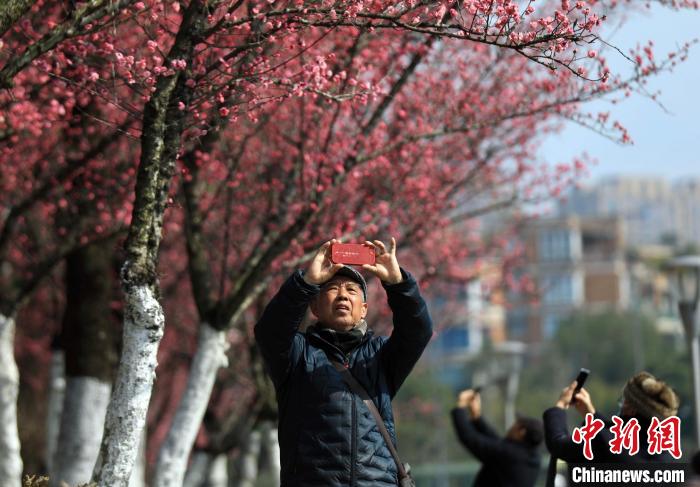 2月10日,四川省成都市錦江河畔的紅梅綻放,吸引市民前來踏春賞梅。圖為市民在錦江邊休閑賞梅。中新社記者王磊攝