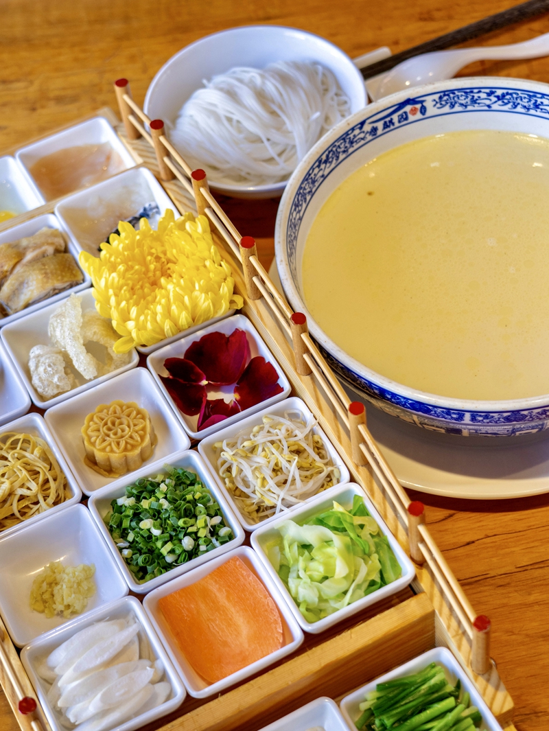 云南人善用春花入菜,如棠梨花炒臘肉、攀枝花蕊燉酸肉,苦刺花蠶豆湯,每一口都是山野的清新。此外,過橋米線、汽鍋雞、麗江納西烤魚等傳統美食,搭配春季野菜如香椿、蕨菜,構成味蕾的“春日交響曲”。