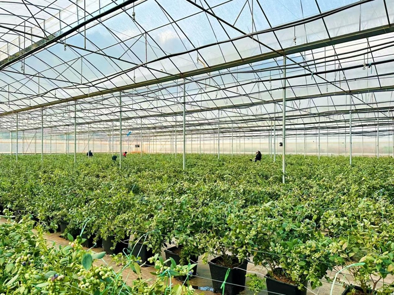 洛河鄉海拔1850米,光照充足,晝夜溫差大,為藍莓的生長創造了絕佳條件。2024年,園區利用新建成的50畝高標準大棚,采用無土基質栽培的方式栽種了26000盆花香藍莓。相比傳統的種植方式,無土栽培更好管理、更省人工且見效快、收益高,當年栽種次年即可掛果,畝均收益提升2倍以上。目前,基地日采摘量在70至80公斤,預計盛果期單日可采摘1.5噸,批發價每公斤80至100元。自去年12月底成熟以來,采摘期可持續至今年4月中旬。