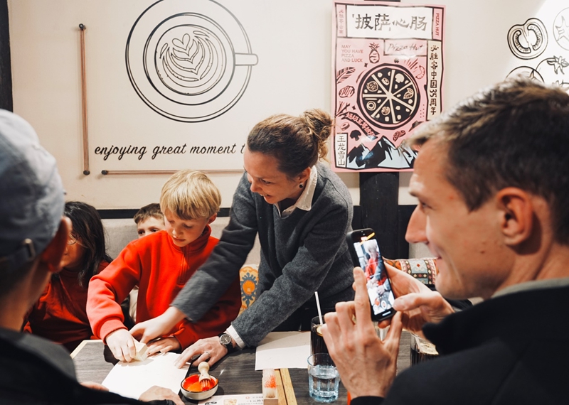 活動現場,必勝客麗江古城餐廳“化身”非遺展示窗口,來自麗江的非遺傳承人和鈞,帶領現場的中外朋友們體驗了——世界上唯一存活的象形文字、國家級非物質文化遺產東巴文的書寫和寓意,由東巴文寫成的“必勝客”吸引在場朋友紛紛拍照打卡。