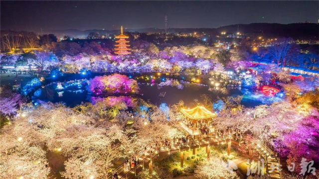 3月25日晚,武漢東湖櫻園,萬余株櫻花在燈光映襯下如夢似幻,游客穿梭其中夜賞櫻花。隨著櫻花進入盛花期,武漢夜櫻在社交平臺上火爆出圈,吸引各地游客組團打卡,感受武漢春天夜晚的浪漫。(湖北日報全媒記者 薛婷 攝)