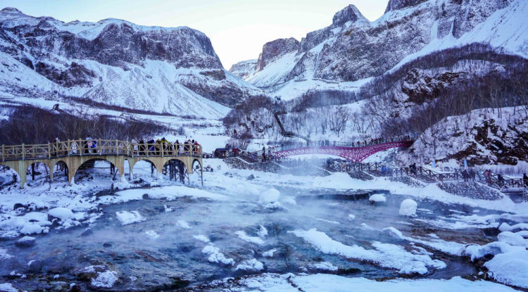 人爽。長白山聚龍火山溫泉部落的溫泉水源自地下深處,涌流日夜不息,在飄雪的冬日泡入溫泉,溫熱泉水瞬間包裹全身,疲憊可拋。