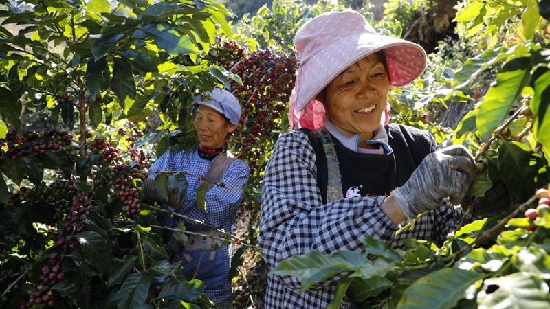 (普洱咖農采摘咖啡果。臧靈/攝)