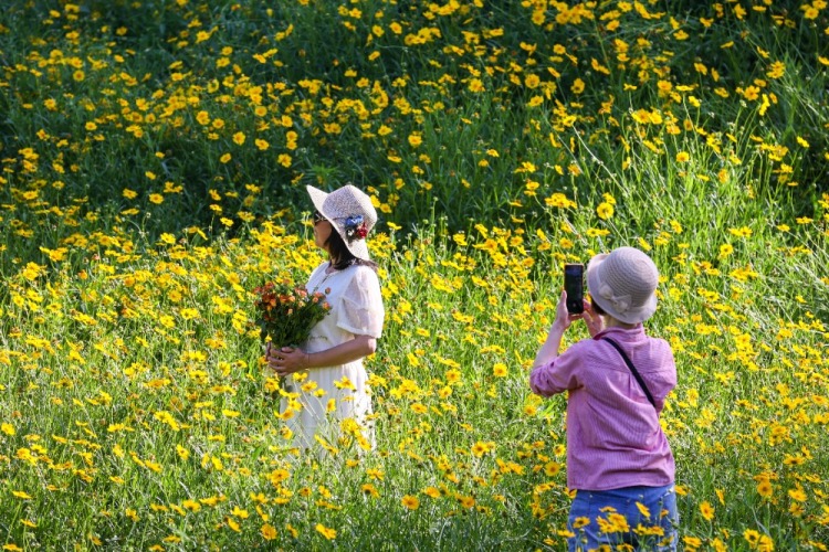 ▲2025年5月12日,江北區塔山公園,盛開的金雞菊迎來眾多市民拍照、打卡。記者 尹詩語 攝