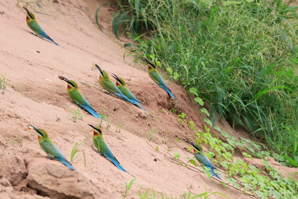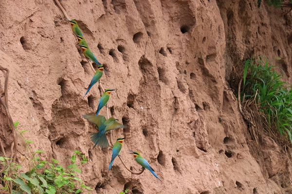 陶正興有著三年拍攝栗喉蜂虎的經驗,比較熟悉這群小鳥的生活習性。據他介紹,每年三四月間,這群小鳥會“組團”從東南亞遷徙至元江流域,喜歡在河岸邊松軟的沙壁上打洞筑巢。更有趣的是,它們還有著一個特殊的習慣,那就是每次繁殖后都會放棄舊巢,選擇新的棲息地。它們羽毛艷麗、身姿輕盈、體態優雅、飛行技術高超,成為元江兩岸一道靚麗的風景線。
