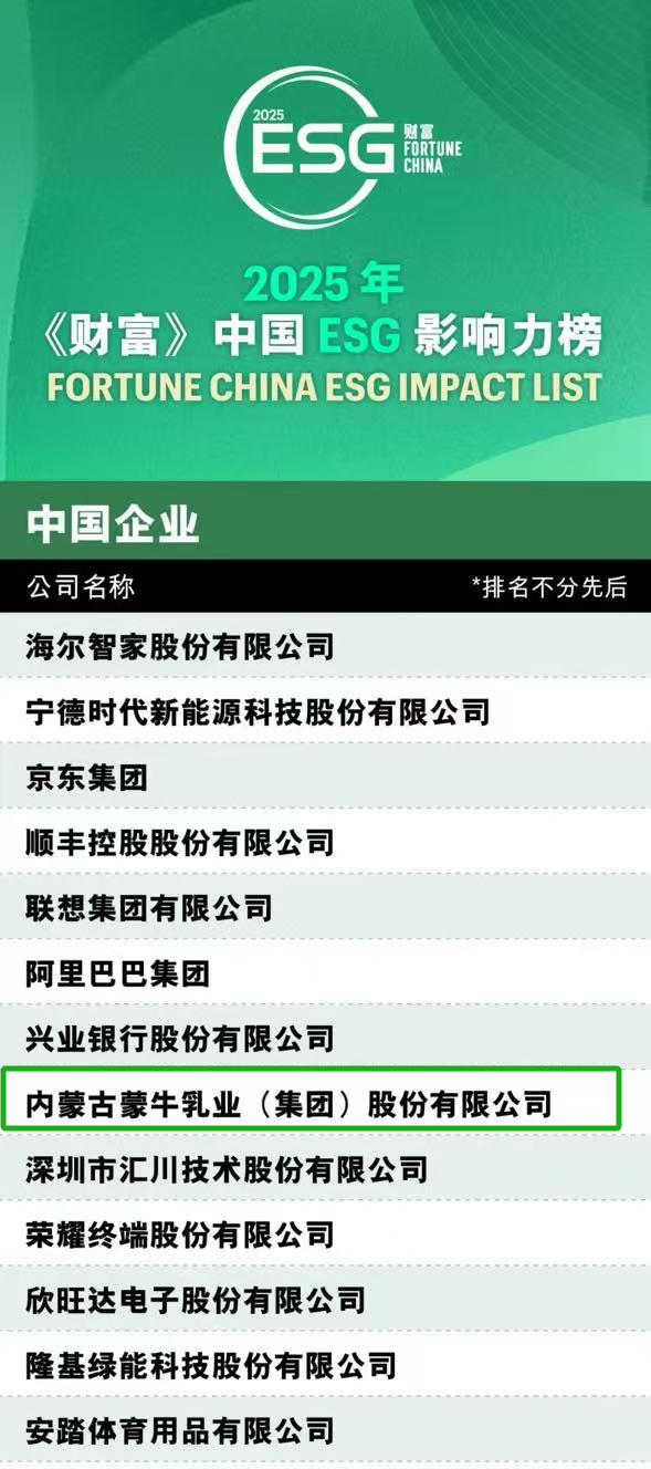 中國乳業唯一!蒙牛榮登2025年《財富》中國ESG影響力榜