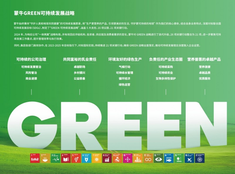 蒙牛以“GREEN戰略”為指引,將可持續發展理念融入治理架構與價值鏈發展過程中,實現環境、社會與經濟效益的平衡發展。