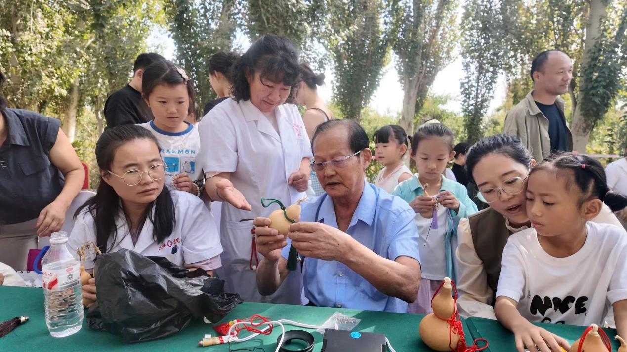 非遺文化展示區則成了傳承文化的小課堂。雙豐葫蘆烙畫傳承人潘耀先現場教學葫蘆烙畫,只見他手持烙鐵,在葫蘆上一筆一劃勾勒出梨園風光,引得不少小朋友前來圍觀。
