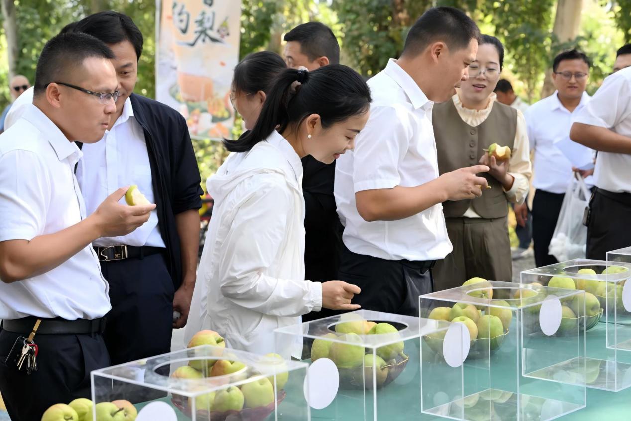 “梨王爭霸”賽上,評委們現場品嘗香梨。周靜靜攝