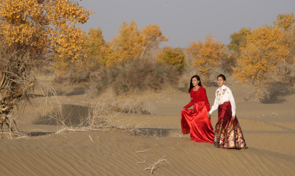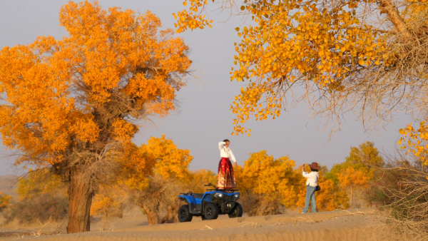 人們從四面八方慕名而來,踩著沙土,穿梭在胡楊林間。阿不都拉?買買提明攝