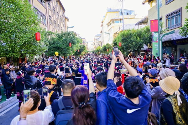 這場舌尖上的交融,只是當天綠春民族團結交響曲的動人序章一角。盛宴開啟前,一場精彩紛呈的民族文化大巡游率先點燃全城熱情。由鑼鼓隊、咪谷方隊組成的禮俗隊伍,莊嚴再現古老祭祀儀式;各鄉鎮民族方隊載歌載舞,生動展示著綠春豐富的農耕文明和民俗風情。特別值得一提的是,今年巡游隊伍中新增了大學生方陣、建水煙盒舞方隊和企業方隊,多元文化的交融互動,贏得沿途觀眾陣陣喝彩,展現了各民族交往交流交融的生動圖景。