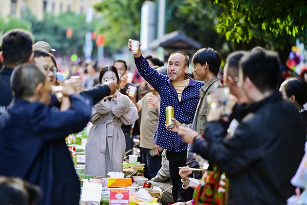 被譽為哈尼族“春節”的“十月年”,是慶祝豐收、祈福納祥的重大節日。當日16時30分,隨著哈尼族“龍頭”一聲祈福令下,綿延近5公里的3265桌長街古宴正式開席,萬人同席、舉杯共歡的壯觀場景,再現了2004年獲評“天下最長宴席”的基尼斯風采。席間,身著民族服飾的哈尼姑娘們,端著醇香的悶鍋酒穿梭席間,主動為游客添酒布菜,來自五湖四海的游客與本地各族群眾圍坐一席,或舉杯共飲,或交流合影,陌生的距離在共品一菜、共飲一杯中悄然消融,大家互道祝福,桌連桌、人挨人的熱鬧場景中,“各美其美、美美與共”的理念悄然傳遞,歡聲笑語伴隨著铓鼓的節奏,在街道上空回蕩、匯聚,生動詮釋著“中華民族一家親”的深厚情誼。