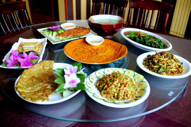 在云南瀾滄,五顏六色的花朵化身七彩“百花宴”,人們把“春天”搬上餐桌,樂享美食盛宴。早晨,飯店老板娘剛從市場購回一批鮮花,雪白的白花、鮮黃的面瓜花、橘色的火燒花、嫩黃的油菜花、淡紫的蘿卜花、翠綠的刺頭花,鮮艷美麗、新鮮無比。再加上芭蕉花、石斛花、攀枝花、苦藤花、白菜花、茶花、樹花,形態各異、色彩繽紛,宛若一道絢爛的七色彩虹。