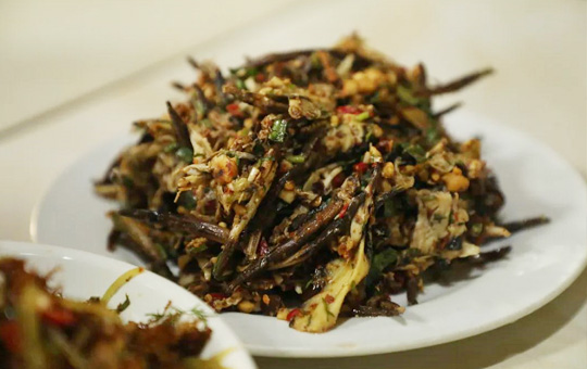 在天氣常如二三月的石林,清明前后是野花、野菜大量入菜的時節,飲食以時令鮮蔬為主。石林的春天干燥易上火,一些味道微苦、清熱去火的蔬菜受到人們的青睞。春天萬物萌發,百花齊放,香椿芽、枸杞尖、沙松尖、龍爪菜、小蛾菜、白剌花、棠棣花……各種水靈靈的嫩芽、小草、野花成為石林人的盤中美食。用糯米粉和青豆米做的“青蛙爬石板”,都是這時節石林獨具特色的當季美食。