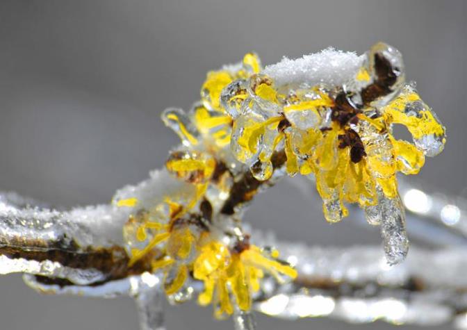 - 金縷梅是春的先鋒,早春時節,當其他植物還沒有一點點春的氣息,金縷梅就悄然綻放在冰雪覆蓋的枝頭上。